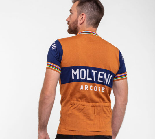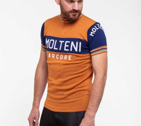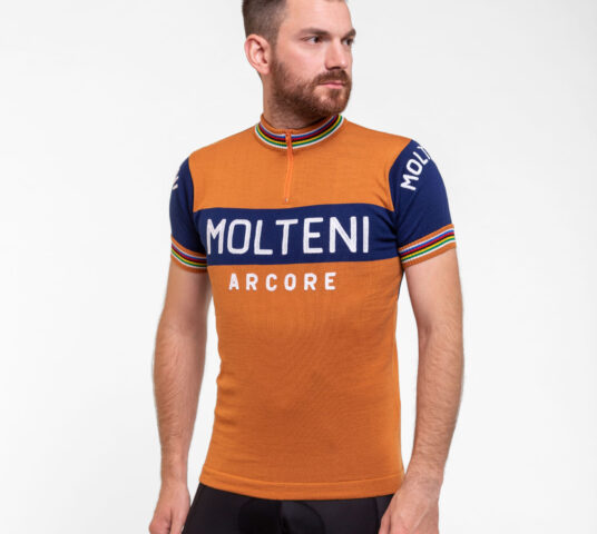 Die belgische Radfahrerlegende Eddy Merckx hat im orangen Jersey seines Sponsors Molteni Titel um Titel geholt und verkörpert wohl wie kein anderer die glorreichen Zeiten dieses Sports. Deshalb durfte ein Replika seines Jerseys keinesfalls in unserer Kollektion fehlen. Und was für eine Legende gut genug war, soll auch dich zu sportlichen Höchstleistungen anspornen: Wie das Originaltrikot ist unser Jersey aus feinster Merinowolle gestrickt, die deine Körpertemperatur reguliert, ohne zu kratzen. Und die Applikationen sind in denselben, seltenen Kettenstich-Stickereien gefertigt, wie zu Merckx’ Zeiten. Ach ja: An den Regenbogenstreifen an Ärmel und Kragen erkennt man in einem Radrennen einen Weltmeister. Also zeig, was du drauf hast in unserem Classic Molteni Orange Short Sleeve Bicycle Jersey.
