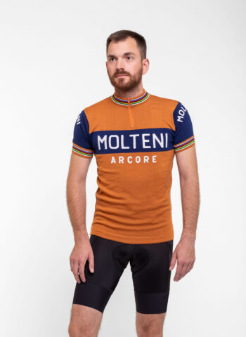 Mit dem Classic Molteni Orange Short Sleeve Bicycle Jersey bist du auf steilen Anstiegen und rasanten Abfahrten nicht zu übersehen – und ausserdem angenehm kühl unterwegs dank feiner Merinowolle.